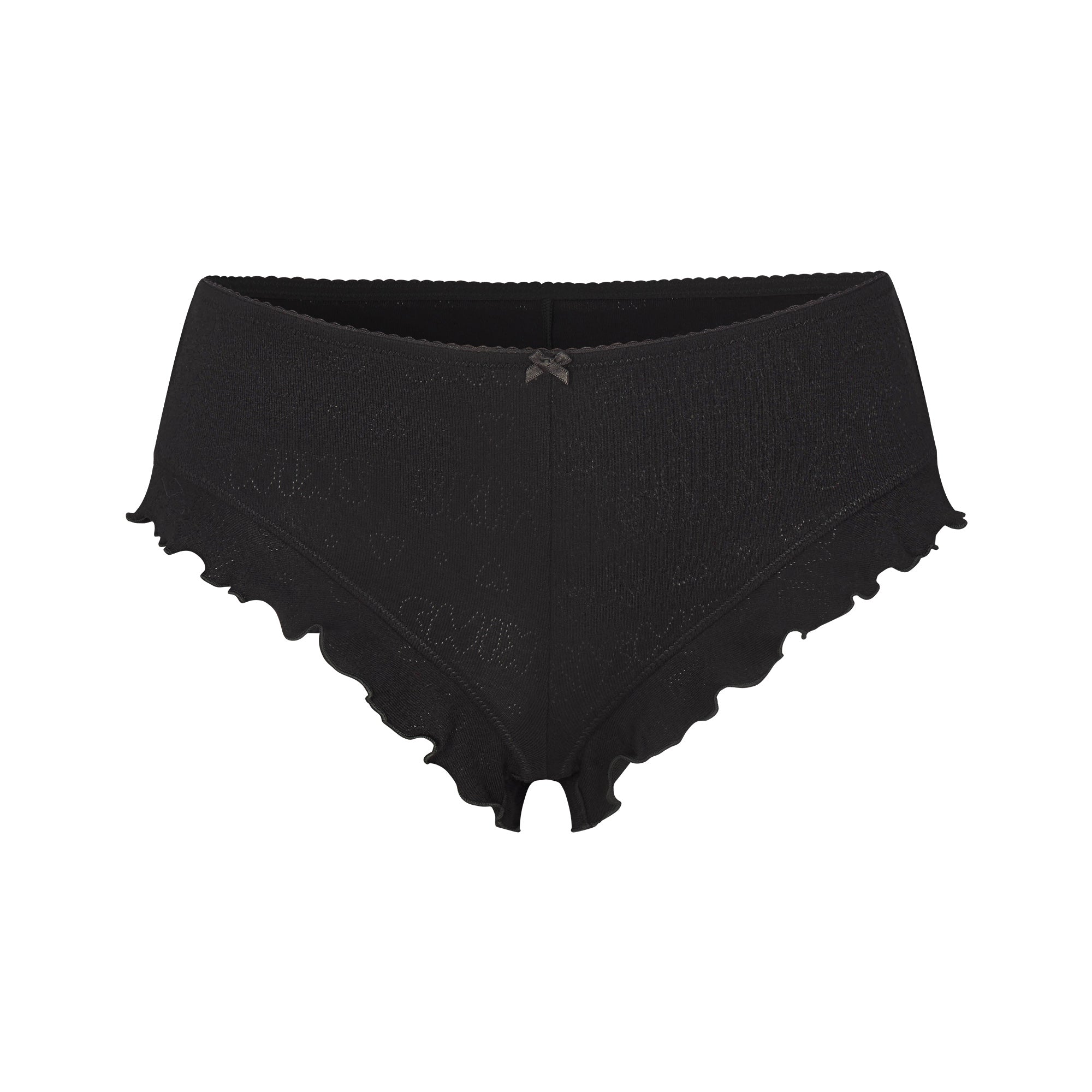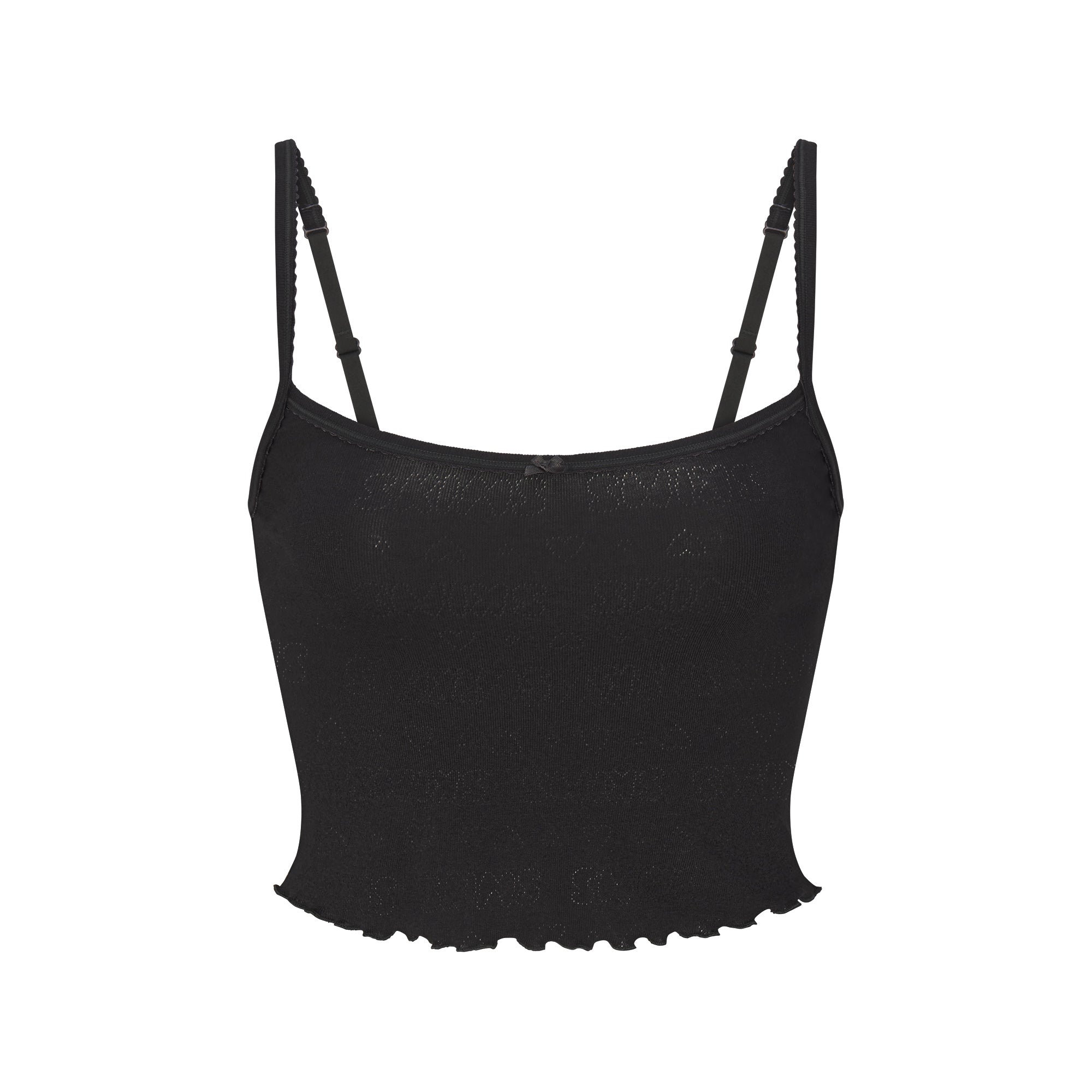 A matching set you’ll adore. Designed in our lightweight pointelle, this set includes a cropped scoop neck cami with adjustable straps, lettuce edge hem, and a satin bow detail. The short includes a picot elastic waistband, ruffle leg opening, satin bow detail, and 100% cotton gusset.