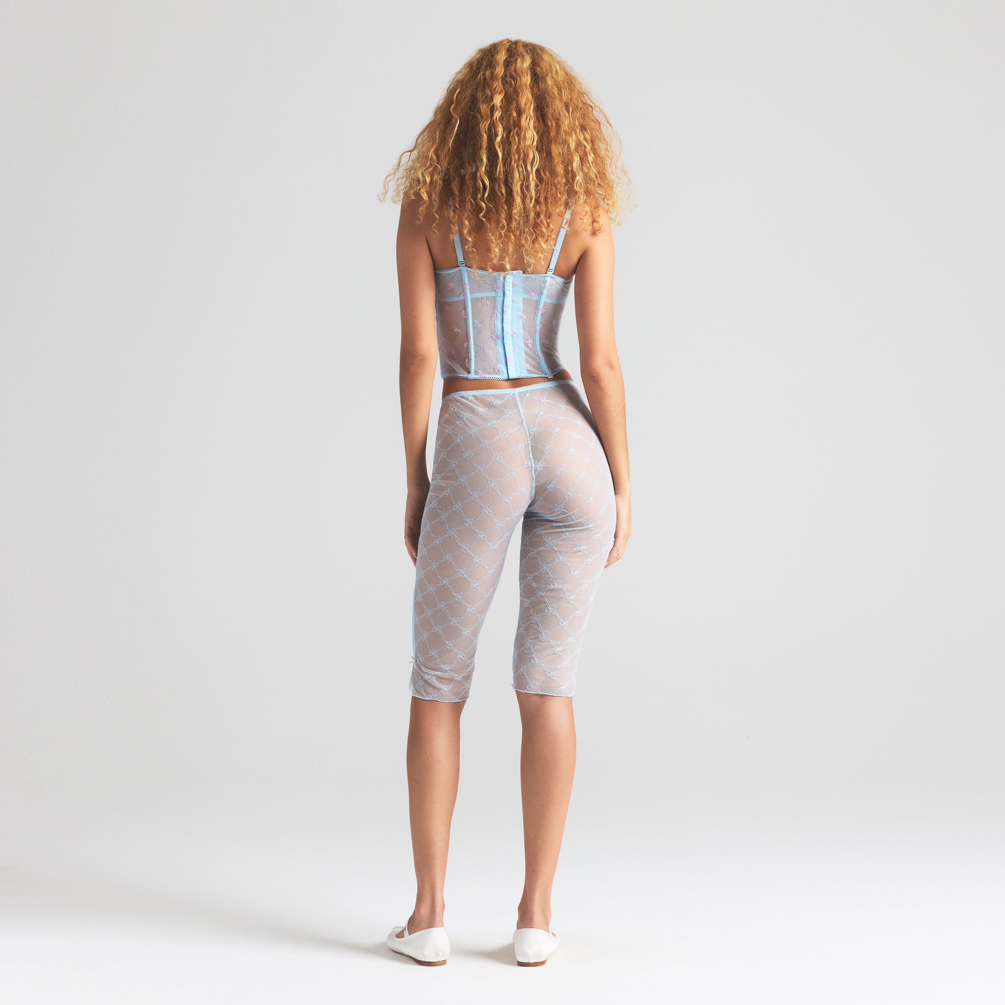 Sheer spring sexiness. Step out in confidence with this mid-rise cropped legging. Made with our embroidered bow tulle, this style features sweet picot trim, bow detailing, and sultry side slits at the hem. Recommended to size down.