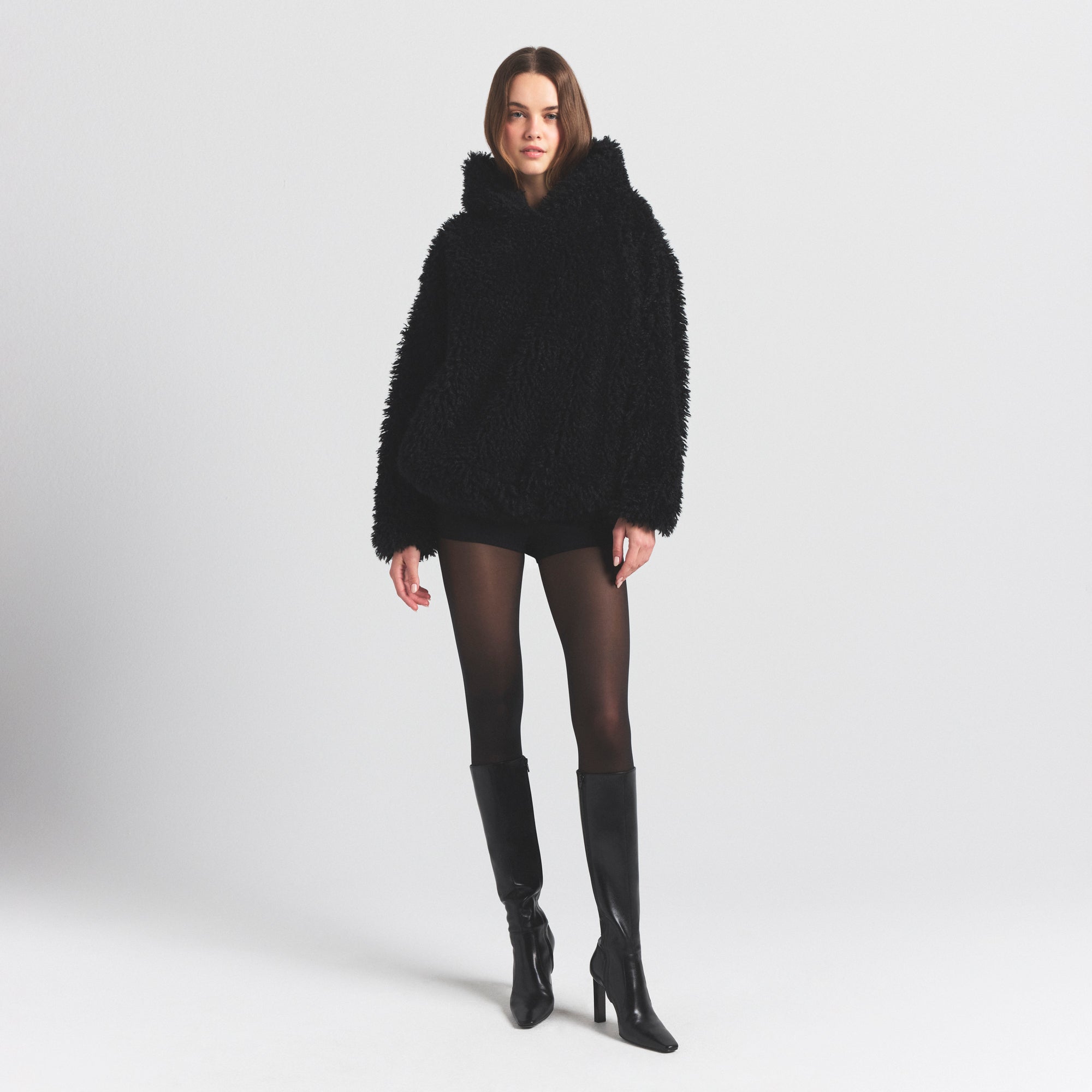 Peak cozy, incoming. This fluffy faux-fur hoodie has an ultra-plush feel and a soft jersey lining for total comfort inside and out. Features an oversized cut with an adjustable bungee hem, drop shoulders, and a side-pocket design.