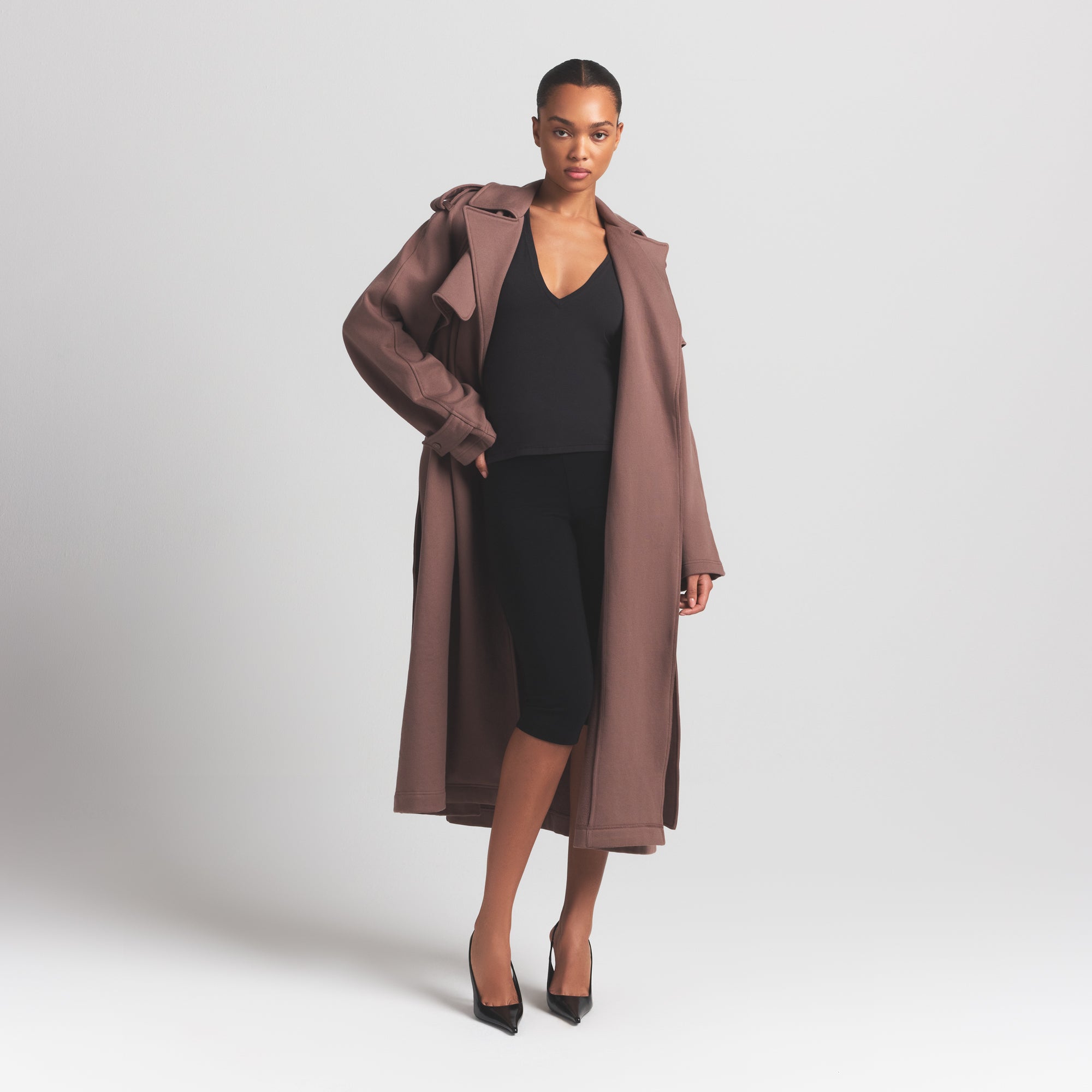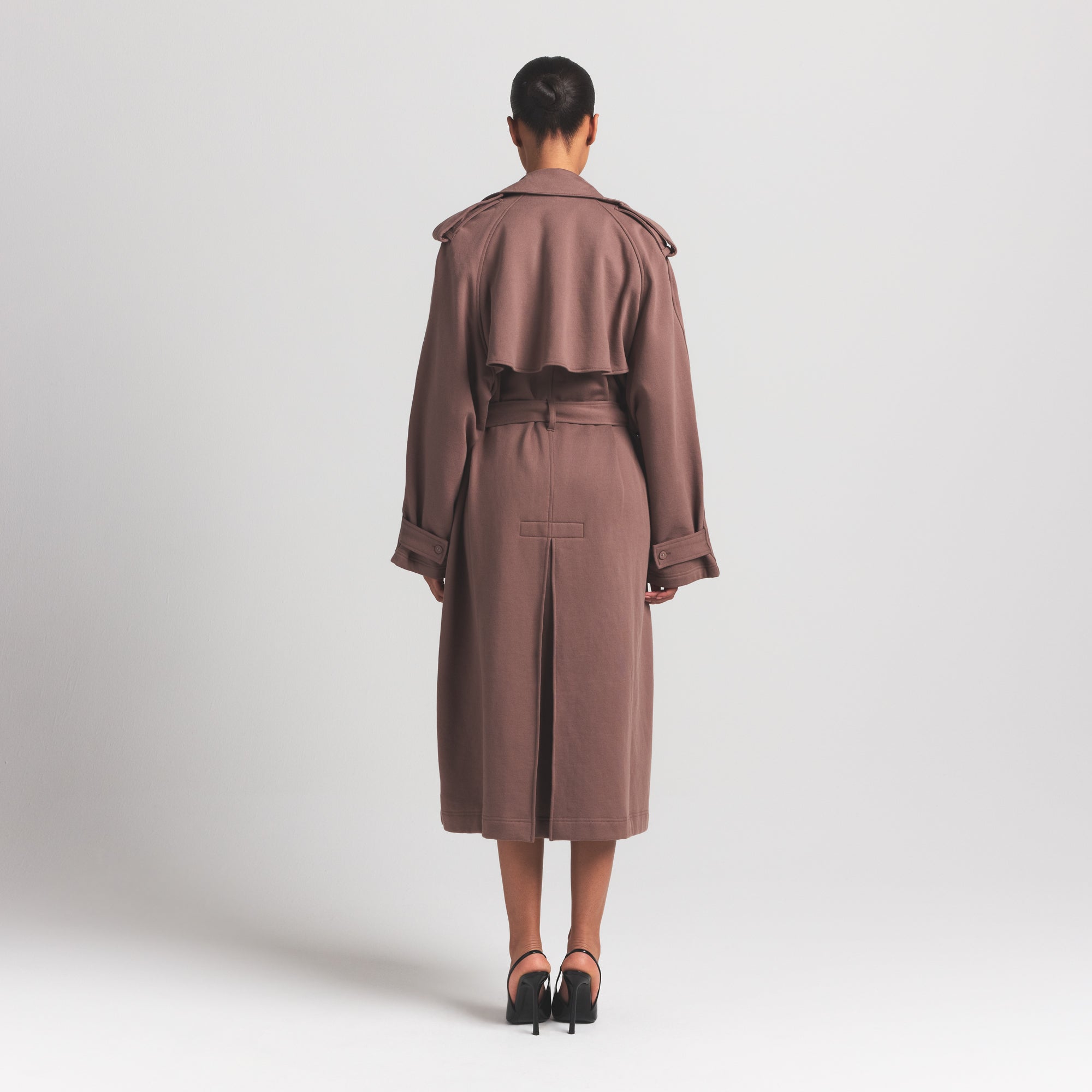 Wrap yourself in warmth. Designed with the warmest heavyweight fleece to keep comfy all season long, this unlined style is the perfect transitional piece for any wardrobe. This long, relaxed-fit coat is effortlessly chic with a pointed collar, back pleat detail, and welt pockets. Self-covered buttoned pieces and front and back storm flaps act as an extra layer of protection. Complete with a self-tie closure for a cinched look.