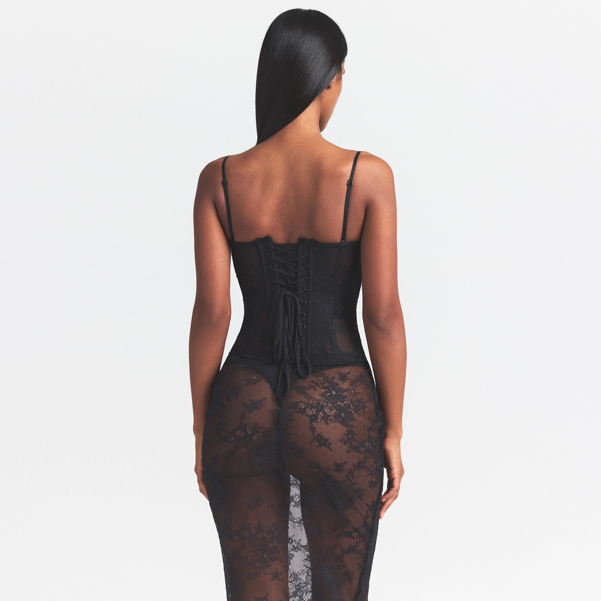 Steal the show. Designed in our stretchy, feminine lace, this floor-length strapless dress features steel boning to flatter your figure. Unlined underwire cups and an interior thong provide light support and coverage. Includes adjustable, removable straps, and a zipper closure with a hook and eye at the left side seam.
